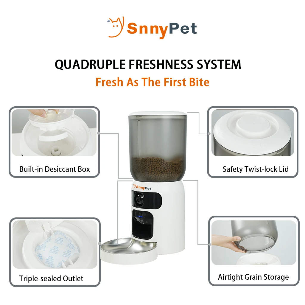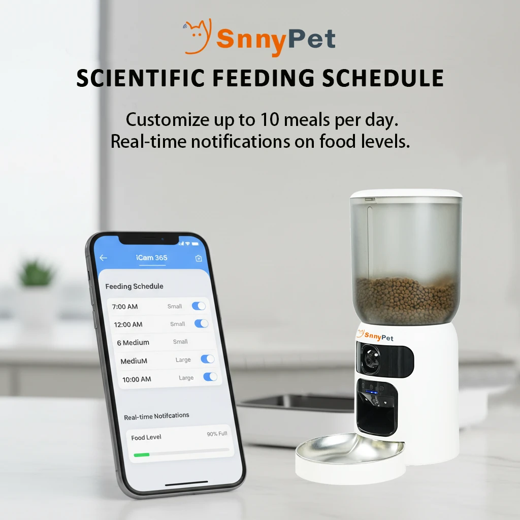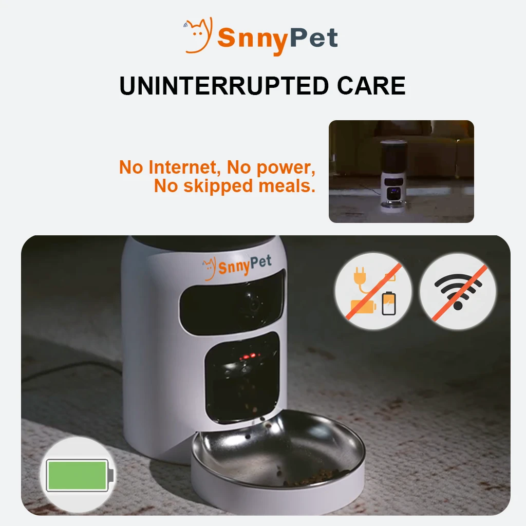 Snny (The Guide): “I want to capture those precious, satisfying expressions when your pet eats. Our top 1080P HD lens acts as your eyes, letting you see their face clearly from anywhere in the world.”